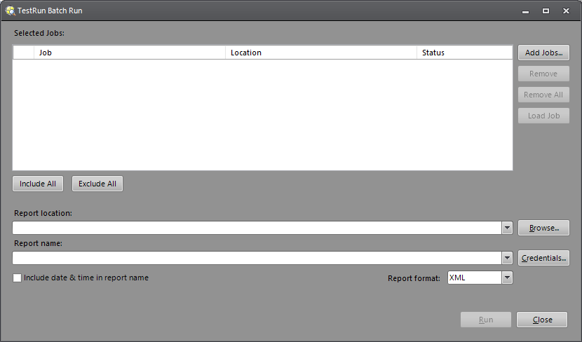 - Run: Press to begin the batch TestRun operations. A job and/or jobs must be selected, a report location specified and a report name created before the Run button is enabled. After pressing the Run button, the Status column of the Selected Jobs table will display the progress of the test execution.