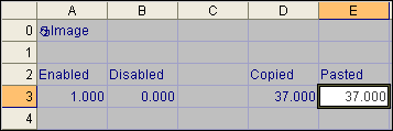The value 37.000 is pasted to cell E3. Note that E3 is Disabled (dimmed), although the copied cell, D3, was Enabled. Since the cell state for D3 was relatively conditional on the value of A3, the state of our pasted version, E3, is now conditionally based upon the value of B3 since we "moved" one cell to the right; the Relative cell state reference translates the same distance (both horizontally and vertically) as the cell contents. Cell E3 is disabled because B3 contains the value 0.000.
