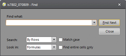 The Find dialog is used to locate a text string or numeric value in the spreadsheet.
