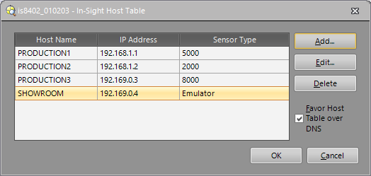 Tip: Delete multiple hosts by holding down the CTRL key while selecting the host names. - Favor Host Table over DNS: When selected, this checkbox specifies that the search order for In-Sight host names is (1) host table, (2) network browser, and (3) DNS. When cleared, the host name search order is (1) network browser, (2) DNS, and (3) host table.