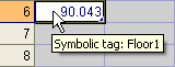 A cell with a symbolic tag has a color-coded triangular indicator in the lower-right corner. When the mouse is placed over a cell with a tag, the name of the tag appears: