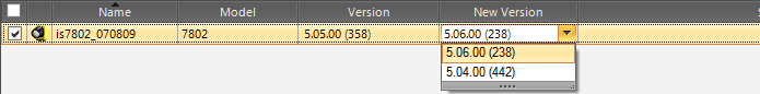 Note:- The New Version column shows the firmware version to be installed to the vision system. Depending on the vision system's Model type, the firmware version to be installed will be different. The vision system can only be updated to the last supported firmware version. For example, an In-Sight 1000 series vision system can only be updated to version 4.x.x, the last supported firmware version. On the other hand, an In-Sight 8405 vision system can be updated to the current version. For a complete list of models and supported firmware versions, see Firmware Versions.