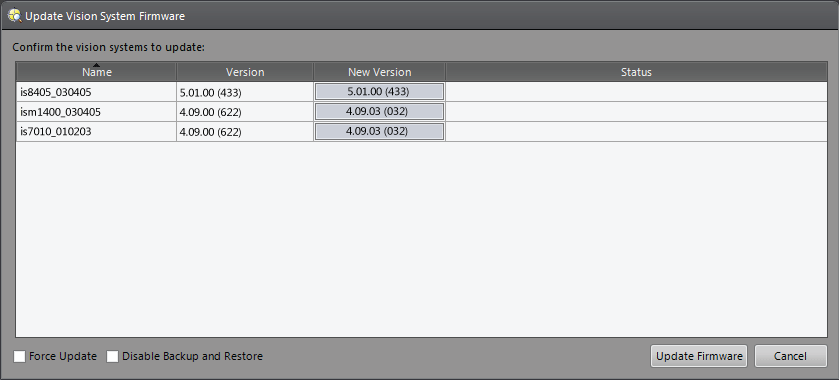 - Multiple vision systems can be updated at the same time even if the New Versions column shows different firmware versions.