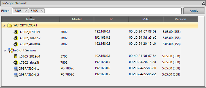 Note: To select multiple columns hold down the SHIFT key and highlight the Column. - The In-Sight vision devices are now sorted in ascending or descending order.
