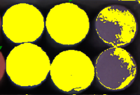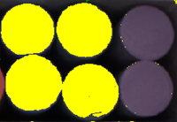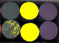 Eliminar color: Elimina el color de la tabla.Si está activada la casilla de verificación Ignorar brillo (valor predeterminado), se contará un mayor número de píxeles que son más oscuros o más claros que los colores entrenados. Esto puede ayudar a mejorar el rendimiento de la herramienta si la intensidad de la imagen no es uniforme en todo el campo de visión. Sin embargo, si se van a contar los píxeles negros y/o blancos además de los colores entrenados, esta opción debe estar desactivada.