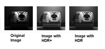 - HDR+ = Ajusta el valor de escala de grises de cada píxel teniendo en cuenta los píxeles vecinos (dependiendo del tamaño de núcleo configurado). Esto proporciona mayor contraste que HDR en las regiones oscuras (subexpuestas) y claras (sobrexpuestas).