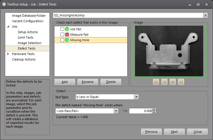In the initial, default configuration, the Job Fail defect will exist for each image; it will automatically be enabled for all of the images designated as "bad" images. When a defect is checked (enabled), it indicates that the defect is present for that image. Defect tests are helpful in determining why a vision application may be incorrectly passing or failing an image. Many vision applications perform several inspections on an image, and cumulatively they produce an overall Pass/Fail result. TestRun allows the vision designer to not only determine if an individual image passes or fails, but it also ensures that the specific defects that are supposed to be detected, are in fact, detected.