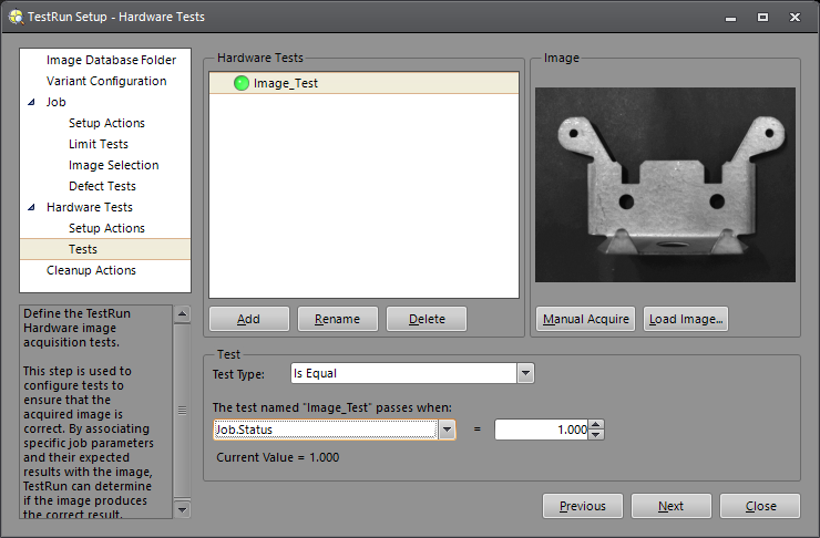 This step is used to configure tests to ensure that the acquired image is correct. By associating specific job parameters and their expected results with the image, TestRun can determine if the image produces the correct result. For example, a dirty lens may lead to blurry, spotted or darker images; the Field of View (FOV) of an In-Sight vision system may change if the vision system is accidentally bumped; or the focus or aperture on the lens attached to the vision system may change over time due to vibrations. All of these scenarios can be tested by associating a job parameter with an expected result; if the expected result is not returned, there's an issue with the image formation.