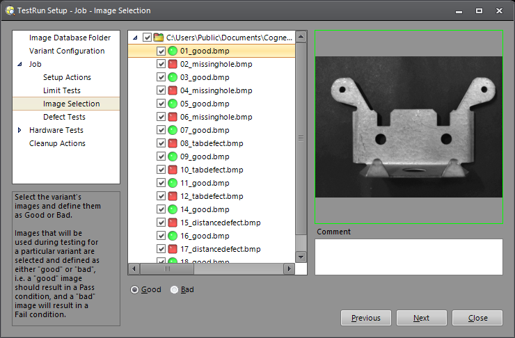 During this screen of the setup, images that will be used during the tests for the particular variant are selected and defined as either "good" or "bad", i.e. a "good" image should result in a Pass condition, whereas a "bad" image will result in a Fail condition.