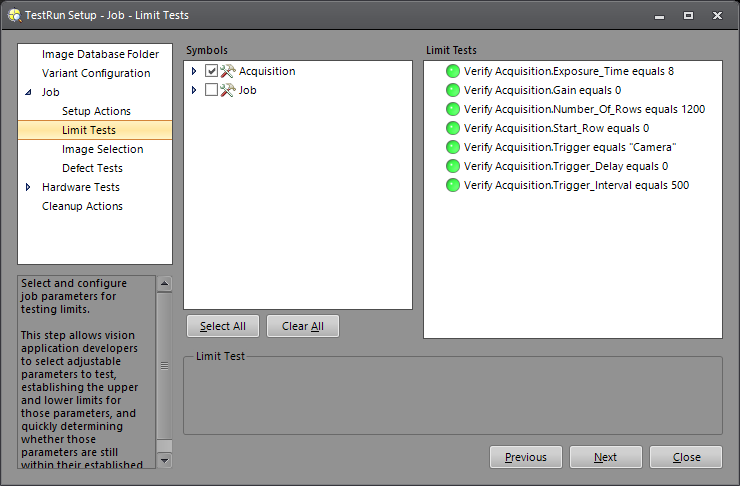 Machine vision applications may include many parameters, which are adjustable by machine operators and maintenance technicians, over the course of time. TestRun Limits Tests allow the vision application developer to select adjustable parameters to test, establish the upper and lower limits for those parameters, and quickly determine whether those parameters are still within their established limits. Utilizing TestRun versus hard-coding limits, for instance, allows the developer to provide flexibility to the operators and technicians to make adjustments to keep the system functioning, while still being able to see when parameters are out of range.