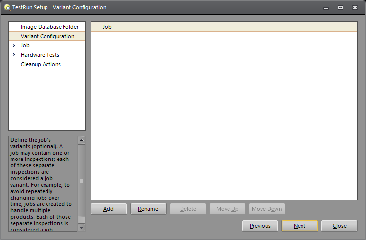Typically, different variants are selected by an external input (e.g. a command from a PLC). Each variant may have its own set of Vision Tools, different search regions, different exposure settings, etc. TestRun is designed to test all of the variants in a job.