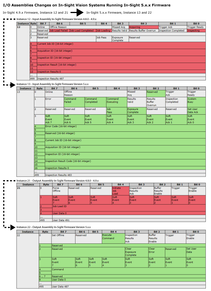このトピックでは、In-Sight ファームウェアを更新する場合、または In-Sight ビジョンシステムのプラットフォーム間を移動する場合に入出力アセンブリオブジェクトに加えられる変更内容をグラフィカルに示します。