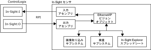 EtherNet/IP ビジョンオブジェクトは、In-Sight センサ内のさまざまなサブシステムのステータスと、In-Sight Explorer スプレッドシートからの着信データと発信データを追跡します。