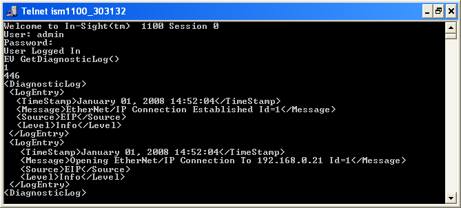 In-Sight センサは、ステータスコード (1) と、その後にバイト単位の文字数 (446) を続けて返して応答します。最後に、診断ログが返されます。