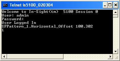 In-Sight ビジョンシステムは、コマンドが正常に実行されたことを示す 1 を返すことによって応答します。ツールの [水平オフセット] パラメータは、0.000 から 100.302 に正常に変更されました。