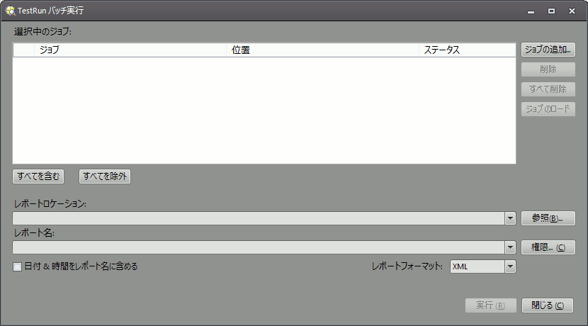 - [実行]: このボタンを押すと、バッチ TestRun 処理が開始します。ジョブを 1 つ以上選択し、レポートロケーションと作成レポート名を指定しなければ、[実行] ボタンは有効になりません。[実行] ボタンを押すと、[選択中のジョブ] テーブルの [ステータス] 列に、テスト実行の進行状況が表示されます。
