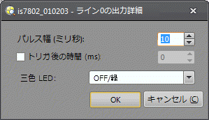• [トリガ後の時間 (ms)]: このチェックボックスを ON にすると、指定された時間 (0 ~ 10000 ミリ秒) の経過後に、出力が行われます。