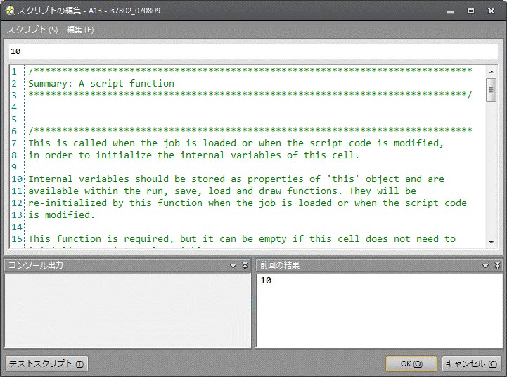 - [テストスクリプト]: 関数を含んでいるセルに現在の JavaScript ソースコードを適用して、セルおよびその依存関係のいずれかを実行します。
