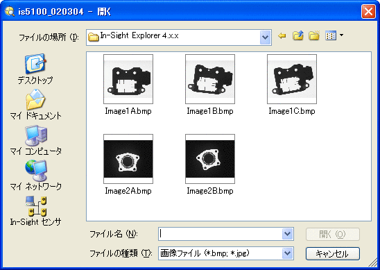 [画像を開く] ダイアログを使用すると、標準の .BMP または .JPG ファイルを In-Sight ビジョンシステムにロードすることができます。画像はロード先ビジョンシステムでアクティブな画像となり、In-Sight ファイルシステムの image.bmp と置き換えられます。