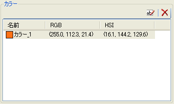 [カラー] テーブルには、ライブラリのカラーが表示されます。このテーブルには、カラーの名前、RGB 値、および HSI 値が表示されます。