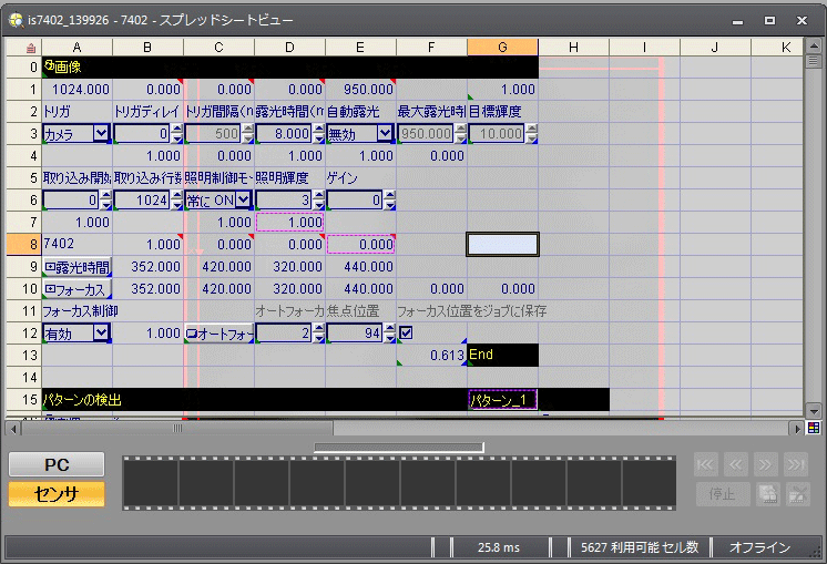 In-Sight Explorer のグラフィカルユーザインタフェース (GUI) の中心的なコンポーネントは、スプレッドシートです。スプレッドシートは、In-Sight センサから取り込まれたビデオ画像に重ねて表示される、調整可能な半透明のオーバレイです。