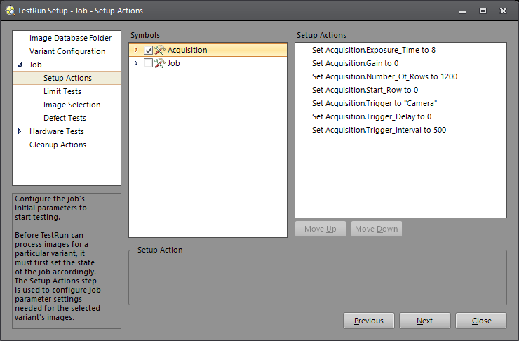 Before beginning its tests, TestRun may need to set some of the job's parameters to mimic the behavior that an operator may perform when setting up a particular variant to run. Generally, if a job has multiple variants, some amount of configuration will be necessary to prepare the job for the selected variant. Before TestRun can process images for a particular variant, it must first set the state of the job accordingly. The Setup Actions step is used to configure the parameter settings needed for the selected variant's images.