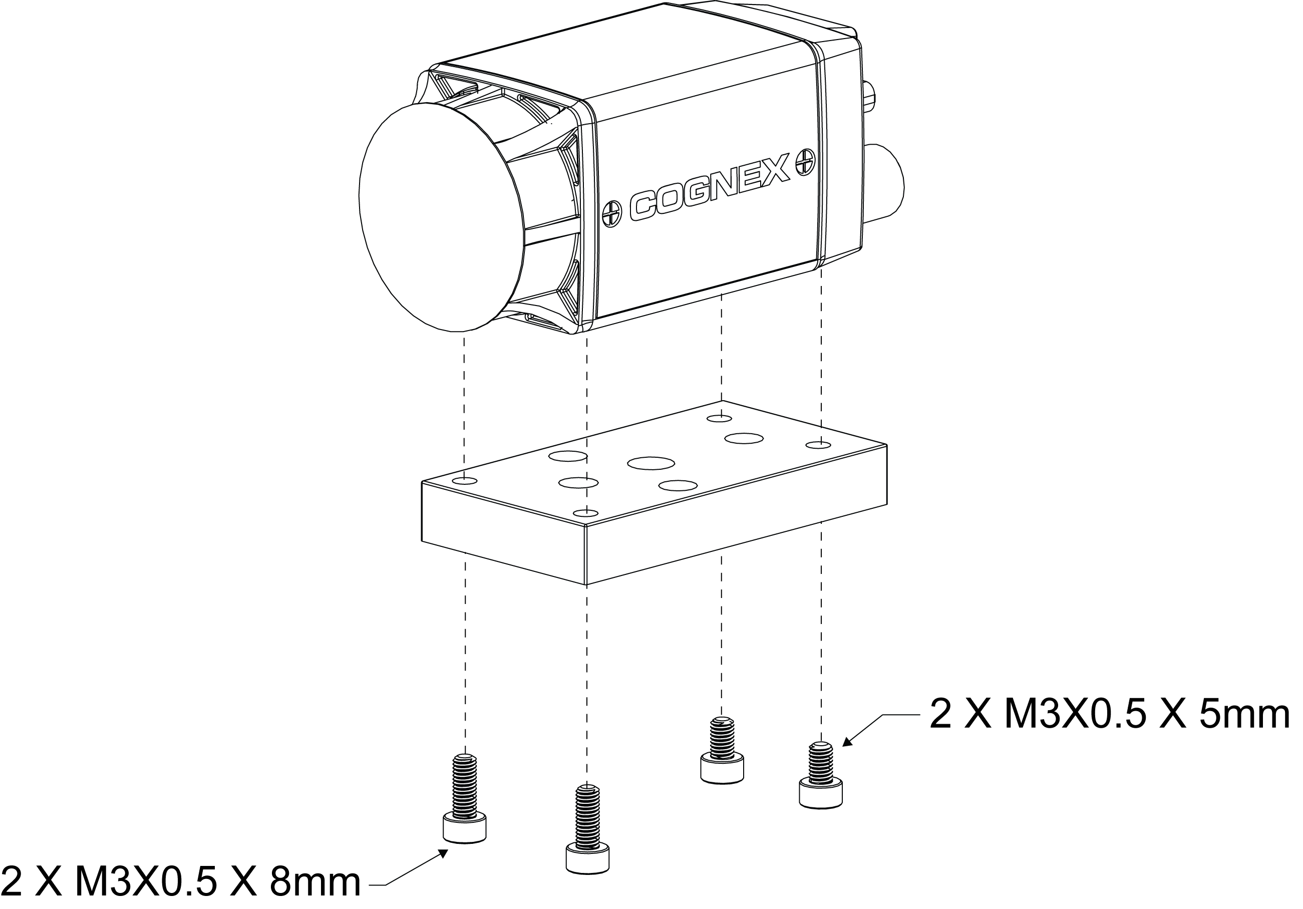 • The accessory mounting kit includes a mounting block and M3 screws (quantity 4) for mounting the vision system and securing it to a mounting surface. The mounting block also provides 1/4-20 and M6 mounting holes for attaching the vision system to a mounting surface. For more information, refer to 8200 and 8400 Series Vision System with Mounting Block (BKT-IS8K-01) and 8405 Vision System with Mounting Block (BKT-IS8K-01).
