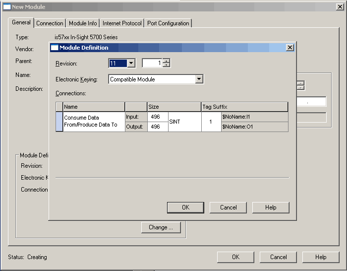 From the New Module dialog, enter the In-Sight vision system's name and IP address, and then click the Change... button to configure the size of the connection.