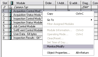 From the HW Config tool, with the In-Sight vision system selected, right-click on the Acquisition Control Module and select Monitor/Modify.