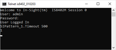 However, you would like to change that parameter's setting via the Set Integer Native Mode command. Issue the command SIPattern_1.Timeout 500 as shown in the following telnet client window: