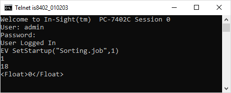 To configure the sensor load the job "Sorting.job" on startup and boot into Online mode, issue the following command: EV SetStartup("Sorting.job",1)