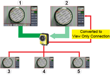 When multiple VisionView applications are connected to an In-Sight vision system, only one VisionView can have the standard view connection. The rest of VisionView applications have the view only connections. In the following illustration, VisionView 1 has the standard view connection (green). VisionView 2 - 5 have the view only connection (red).