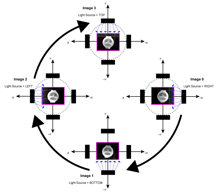 The SurfaceFX algorithm requires four images to be acquired, in sequence, from four individual, low angular (less than 45°) light sources. The light sources should be spaced evenly around the circumference of a circle, with the object placed under the center of the lights. During the acquisition phase, the object should remain stationary, and the lighting and image acquisition sequence must be clockwise; starting from the right quadrant of the object, followed by the bottom quadrant, then the left quadrant, and finally the top quadrant.