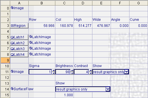 For fourth image, lighting from the top side is activated and an image is acquired. The Latch4 Button (cell A8) is then pressed to store the acquired image in the LatchImage cell at B8.