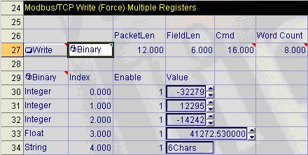 These values are in the floating-point format. In the ProfibusGateway.cxd file, the BGetInt function in cell D21 reads the binary value at Byte 15 (the lower byte of the word read).