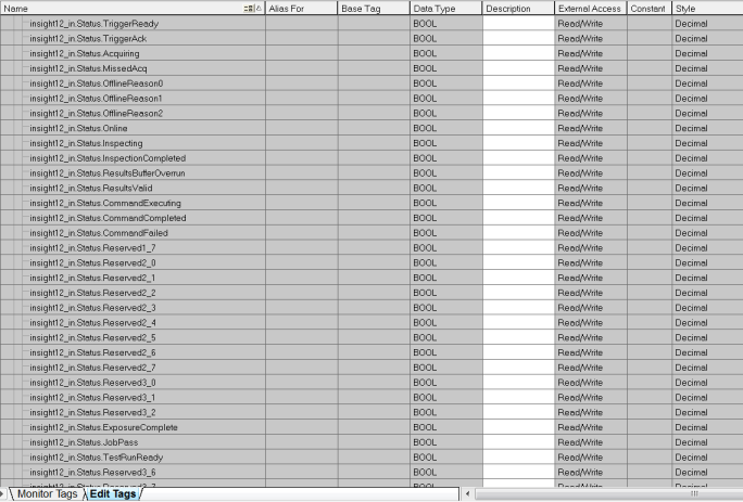When writing your ladder program, reference the elements in the structured data variables; the copy rung above will automatically move the data to and from the structured data instances to the EtherNet/IP connection. It is important to note that the newly added camera module data will exist in Controller Tags. The User Defined data instances will exist in the Program Tags. You should write your ladder program only referencing the User Defined data instances in Program Tags. Download and run to get the tags to copy data initially, otherwise an array of SINTS will be all that is seen.
