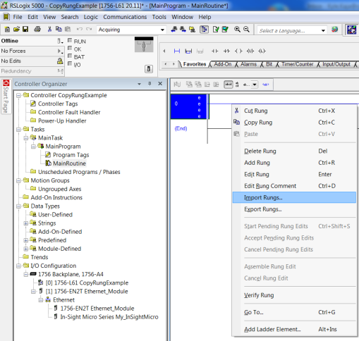 After adding the vision system to the RSLogix project, the L5X rung import file can be used to create structured data for the connection. Within the main program, right-click on an empty rung and select the Import Rungs... option. Navigate to the InSight_12_CopyRung.L5X file and click the Import... button.