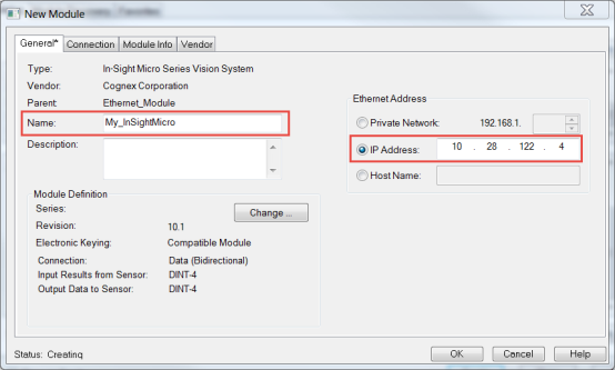In the New Module dialog, enter the In-Sight vision system's name and IP Address and click the Change... button.