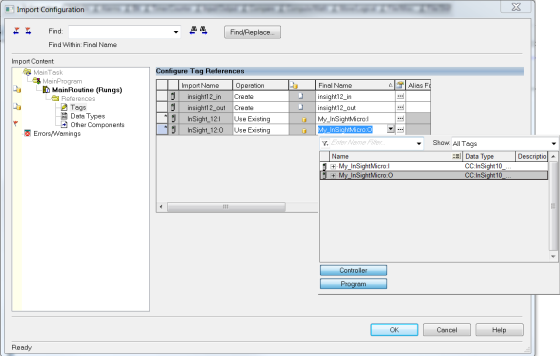 In the Import Configuration dialog, select Tags and change the names of the created tags to match the configuration. Set the InSight_12:I and InSight_12:O tags to the connection controller tags in the project so that they match the name given to the In-Sight vision system connection.