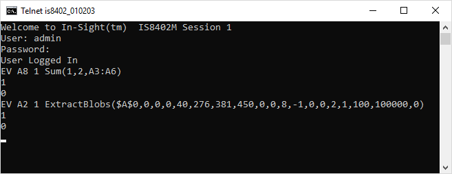 While logged on to the vision system through a telnet client, type the following command: EV A8 1 Sum(1,2,A3:A6)