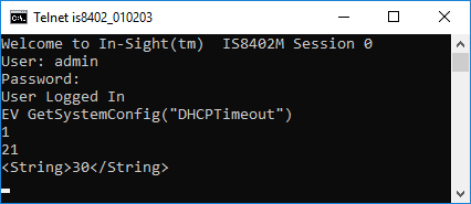 The In-Sight vision system responds with a status code (1), followed by the number of characters, in bytes (21). Finally, the DHCP Timeout information (30) is returned.
