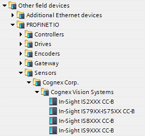 Firmware Version and In-Sight model GSD file Description 5.8.0 or later, except In-Sight 5705/5705C vision systems* V2.34 (GSDML-V2.34-Cognex-InSightClassB-xxxxxxxx.xml) Supports Conformance Class B (newer PROFINET stack). The Class B configs are suffixed with CC-B, indicating that the config is Class B (for example, In-Sight IS2XXX CC-B). 5.7.x or earlier and In-Sight 5705/5705C vision systems V2.3 (GSDML-V2.3-Cognex-InSight-xxxxxxx.xml) Uses the original Conformance Class A PROFINET stack. *The In-Sight 5705 and 5705C vision systems do not support Conformance Class B and V2.34 GSD. To add an In-Sight vision system to a PROFINET network, browse to the In-Sight node of the Hardware Catalog (PROFINET IO > Additional Field Devices > Sensors > Cognex Vision Sensors), and then drag an instance of the In-Sight vision system into the PROFINET IO System in the hardware configuration.