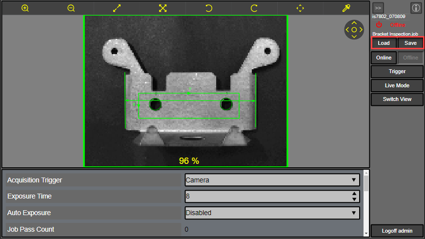 The Load and Save buttons on the Web HMI Run Mode Controls Pane allow you to load and save a job from and to a vision system/sensor (including RAM Disk and SD Card), a local PC or a remote location.