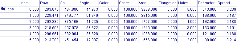Once the image has been processed, it will have been segmented into Blob and Background pixel values. The Blobs found in the ROI will be identified based upon their physical characteristics and assigned values, such as the blob's location in the image (it's Row, Column coordinates), its area, perimeter, spread and elongation. The data from the extracted blobs is stored and reported in a Blobs data structure.