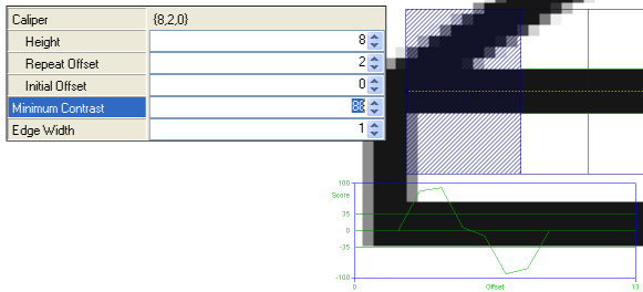 Specifies the minimum greyscale contrast transition (0 to 255; default = 5) to be considered an edge. For each indexed Caliper, a contrast graph, drawn in blue, is displayed on the image. The values in the chart are automatically scaled to a 0-100 value. Utilize this chart when applying this parameter to properly adjust the value. |