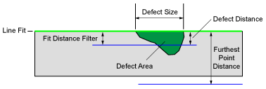 The InspectEdgeForDefect function is used to construct an edge model to perform advanced edge analysis on the edges or edge pairs returned by an InspectEdge function. This data is used to construct a best-fit line fit to compare found edges or edge pairs against, detecting defects and gaps, such as the distance from the line fit.
