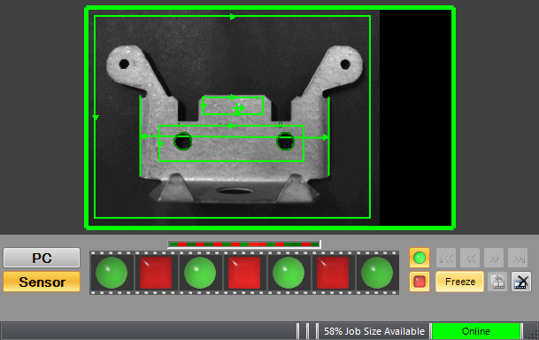 - View the updated status graphics in the filmstrip, which represent the pass/fail results. The vision system remains Online, but the filmstrip stops updating and enters "frozen" mode (indicated by a yellow bar at the top of the display area) if any of the following occurs: