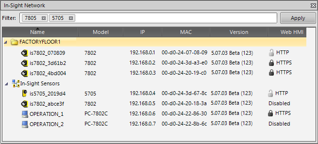 • Filter textbox: Filters the In-Sight devices. For more information, refer to the Filter Operations Using Tokens section in this topic.