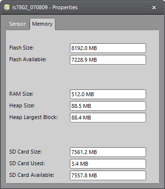 • Properties: Displays details of the hardware information and network identification, as well as the flash, RAM memory and SD Card configuration.