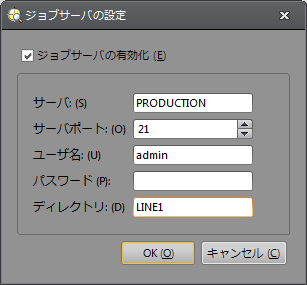 FTP サーバの [サーバ]、[サーバポート]、[ユーザ名]、[パスワード] を入力します。必要に応じて、ジョブを保存またはロードする場合の FTP サーバにおけるディレクトリ名 (または、ディレクトリパス) を入力します。